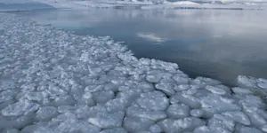 ice crystals formed in turbulent water, as in swift streams or rough seas