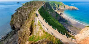 a narrow strip of land, bordered on both sides by water, connecting two larger bodies of land